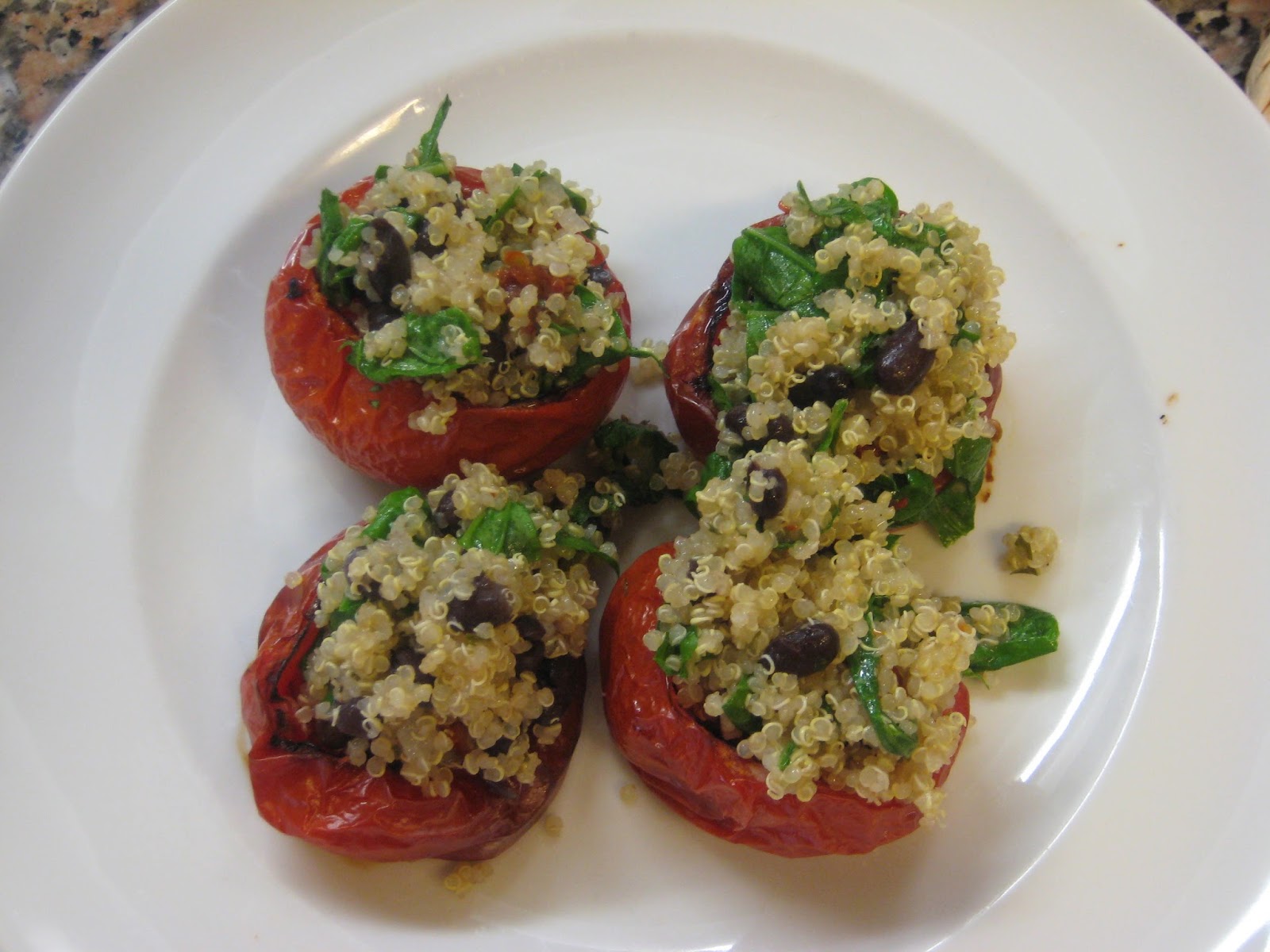 Coloque os tomates assados numa travessa e recheie com a quinoa. Regue com um fio de azeite e sirva quente.